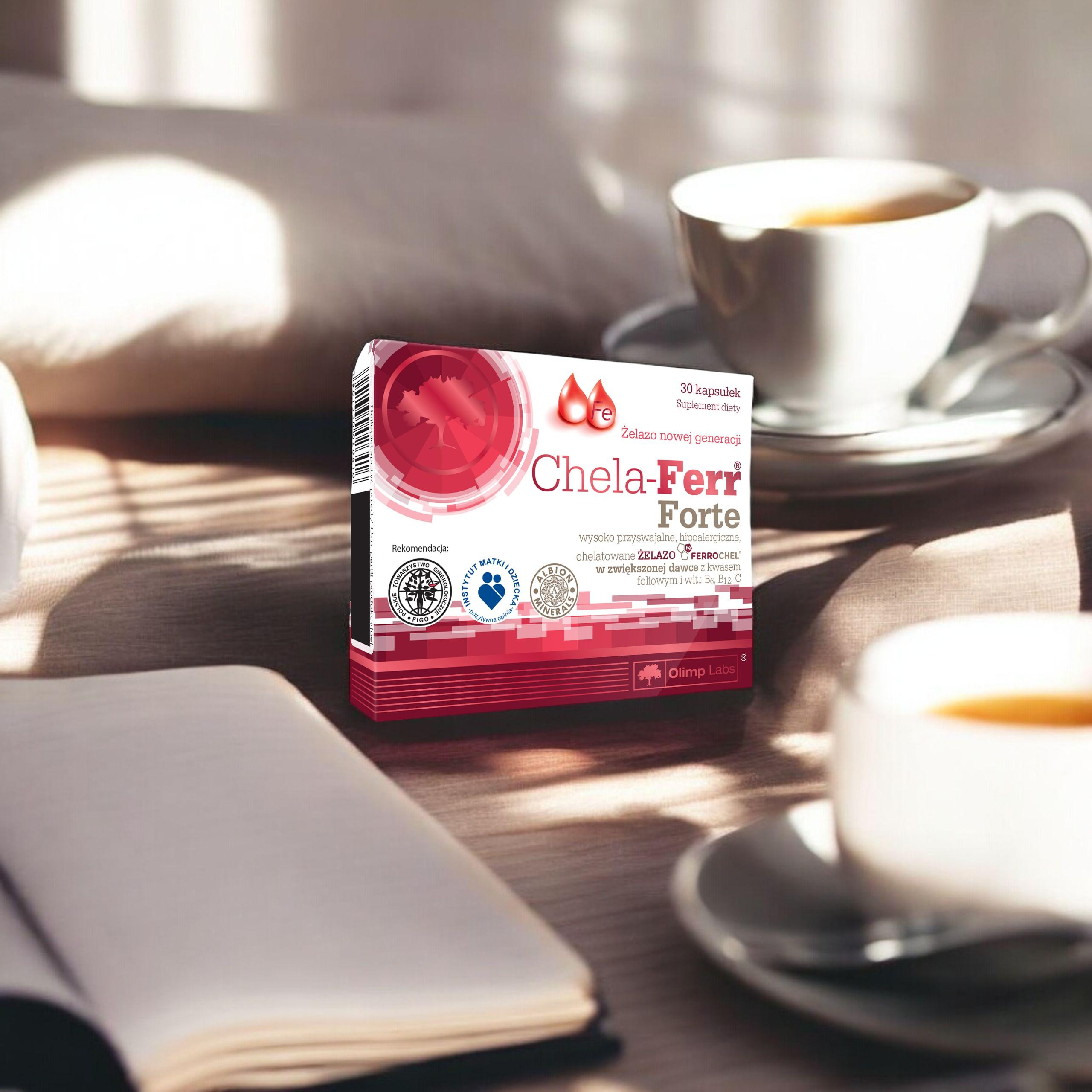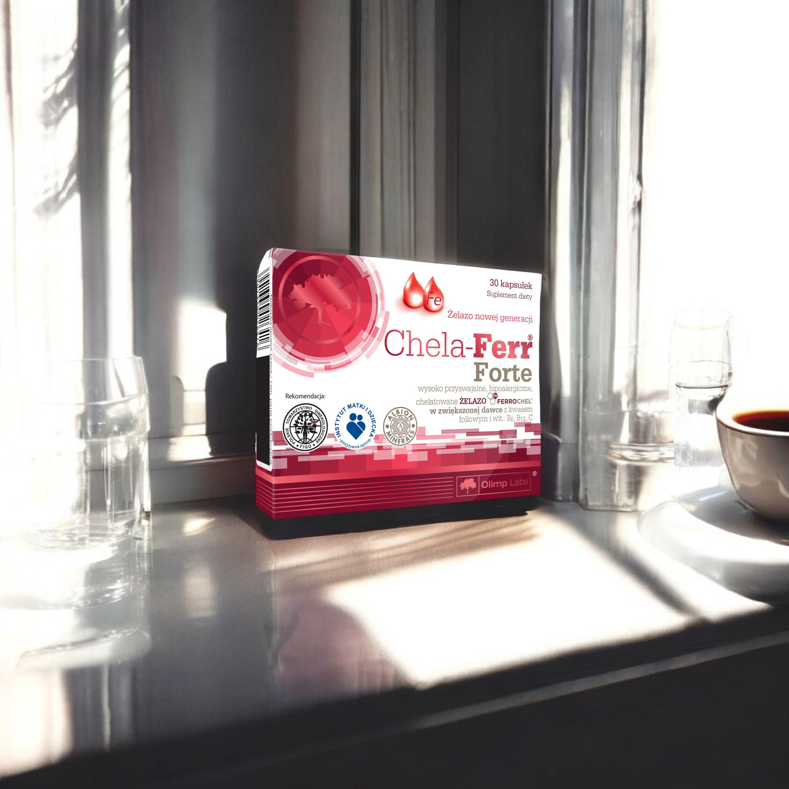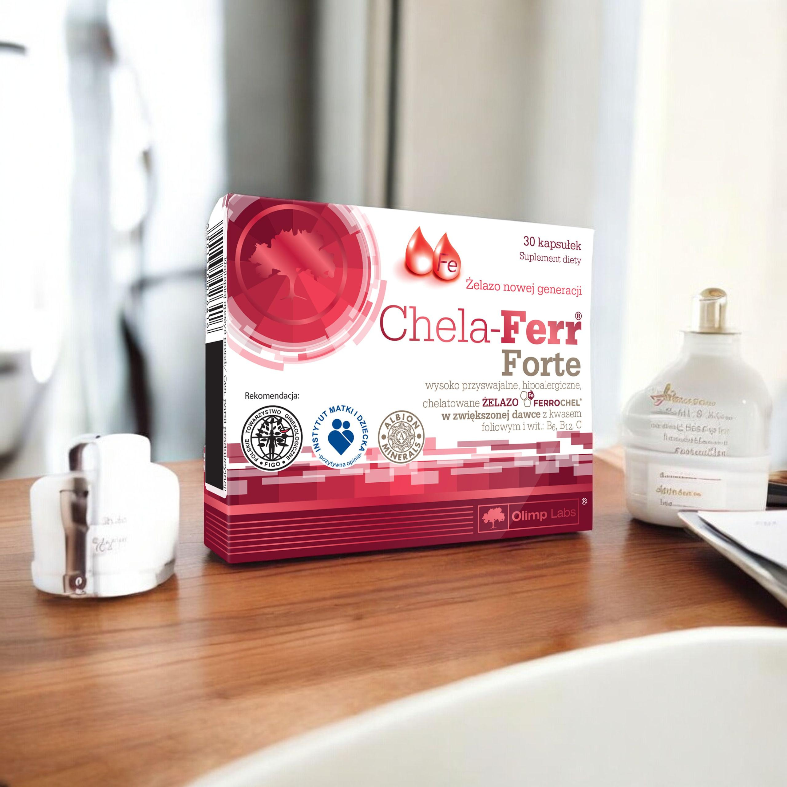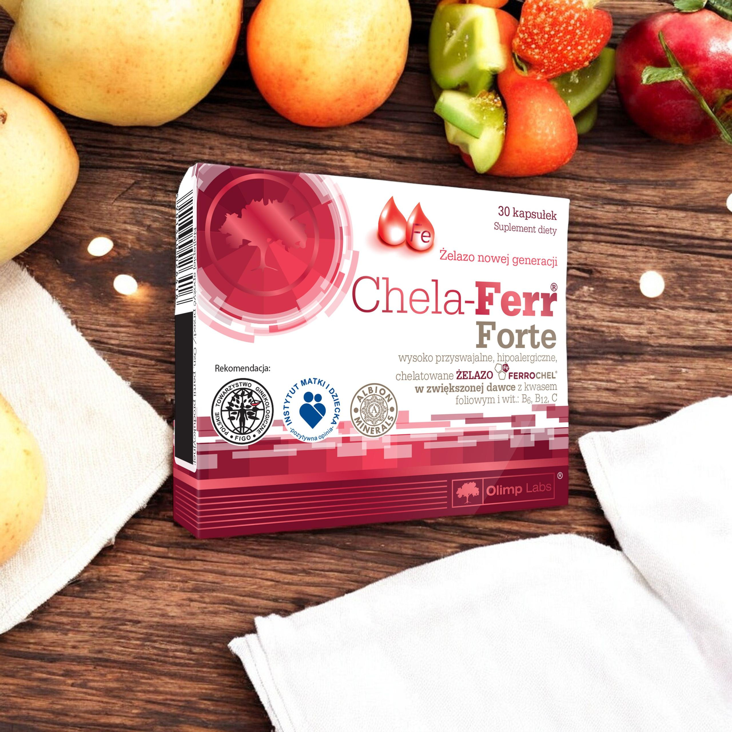 - CHELA-FERR® FORTE to suplement diety zawierający żelazo Ferrochel® w postaci chelatu aminokwasowego, czyli wysoko przyswajalną i dobrze tolerowaną postać żelaza w zaawansowanym kompleksie z kwasem foliowym i witaminami C, B6, B12.
