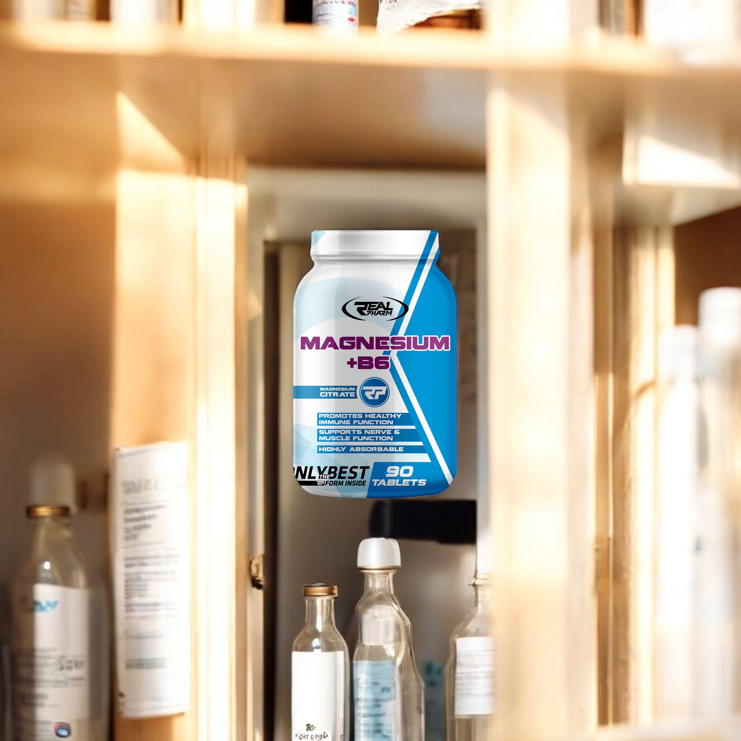 • Magnesium + B6 od Real Pharm to wysokiej klasy suplement w tabletkach o masie 1350 mg, uzupełniający dietę w magnez i witaminę B6.