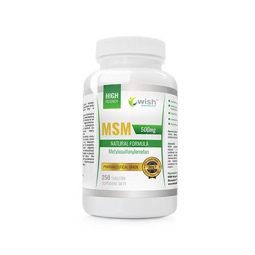 - Produkt MSM od firmy WISH Pharmaceutical występuje w formie 250 tabletek łatwych do połykania. Zawiera aż 500 mg siarki organicznej w jednej tabletce. Wystarczy suplementacja już 1 tabletki dziennie, co oznacza ponad 8 miesięcy codziennej suplementacji.