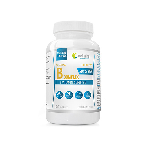 • Wish Vitamin B Complex to suplement zawierający 8 witamin z grupy B, które pomogą w utrzymaniu sprawności umysłowej na prawidłowym poziomie i walce ze zmęczeniem i znużeniem. Jedna porcja zapewnia 100% zapotrzebowania na witaminy z grupy B.