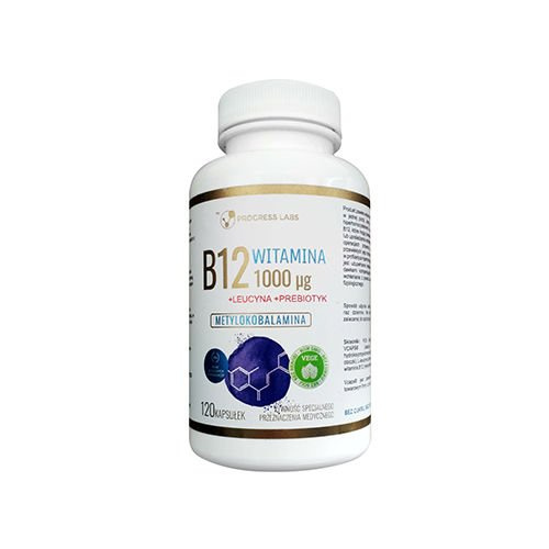 - Produkt Vitamin B12 1000mcg + Prebiotyk od Progress Labs to suplement diety zawierający witaminę B12 w postaci metylokobalaminy, z dodatkiem prebiotyku który jest przyjazny dla dobrych bakterii obecnych w jelitach.