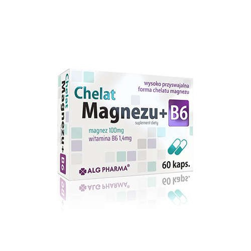 - Chelat Magnezu + B6 to suplement diety ALG Pharma, który wspiera prawidłowe funkcjonowanie układu nerwowego i mięśniowego oraz podnosi funkcje psychologiczne. Zawiera wysoko przyswajalną formę chelatu magnezu wzbogaconą o witaminę B6.