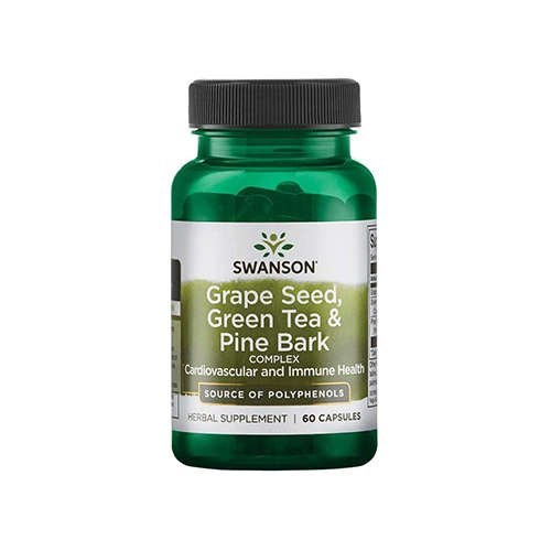 Swanson Grape Seed, Green Tea & Pine Bark zapewnia szerokie spektrum ochrony. Formuła łącząca silne polifenole z zielonej herbaty z oligomerycznymi proantocyjanidami znajdującymi się w korze sosny i pestkach winogron działa synergicznie wzmacniając układ odpornościowy organizmu. Pestki winogron zawierają bogactwo składników odżywczych. Są źródłem witaminy C i beta-karotenu, które neutralizują szkodliwe działanie czynników zewnętrznych. W ich składzie znajdują się także antyoksydanty, takie jak polifenole, tokoferole oraz aktywne biologicznie bioflawonoidy zwane oligomerycznymi proantocyjanidami, które ze względu na swoje właściwości nazywane są "super przeciwutleniaczami". Proantocyjanidy w zwalczaniu niektórych wolnych rodników są nawet kilkadziesiąt razy silniejsze niż witaminy C i E. Ekstakt pozyskiwany z kory sosny, inaczej zwany Pycnogenolem, zawiera prawdziwe bogactwo antyoksydantów.