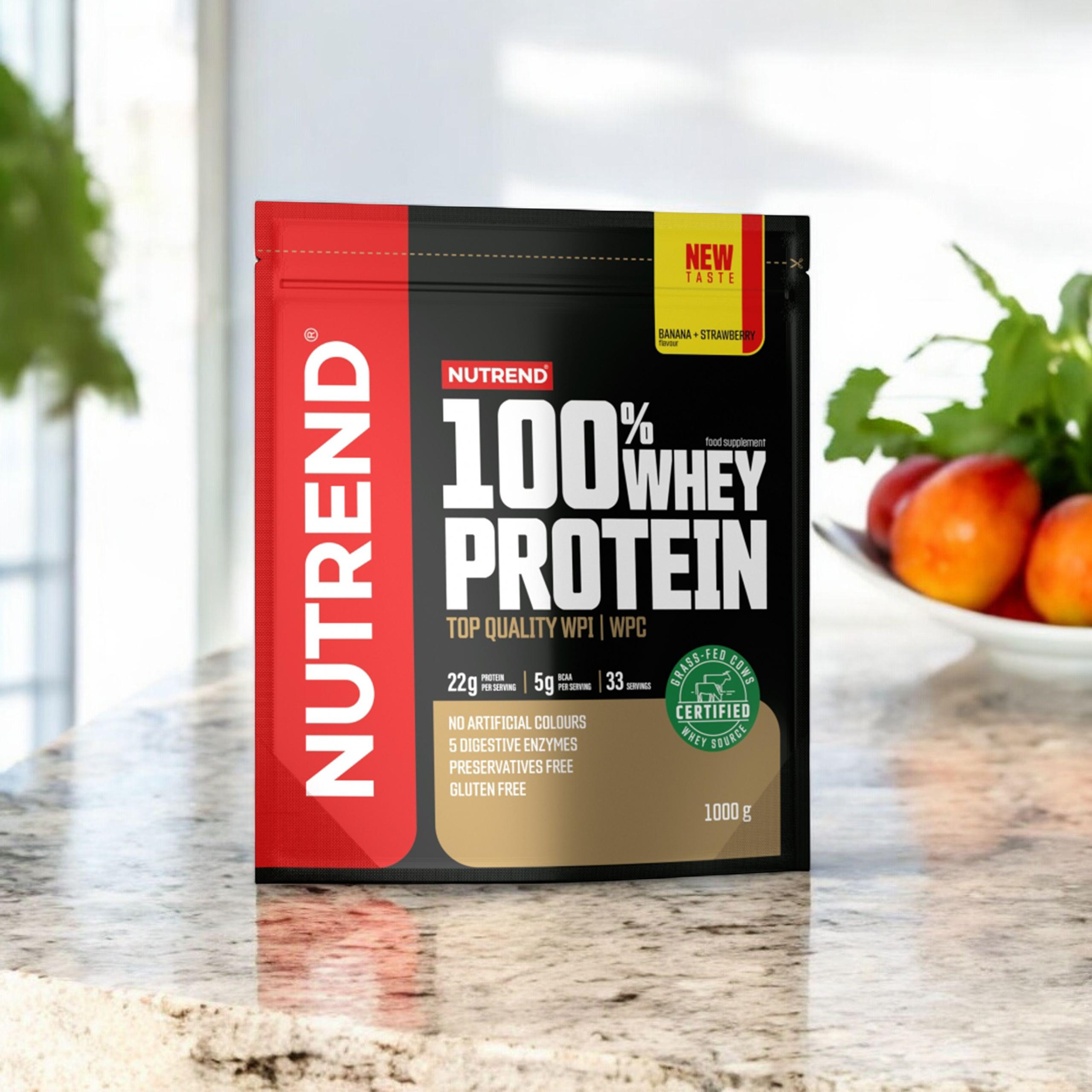 100% Whey Protein marki Nutrend pozwala szybko i łatwo uzupełnić niedobory białka w diecie. Białko to podstawowy składnik mięśni, który przyczynia się do prawidłowego funkcjonowania całego organizmu. Jest to szczególny markoskładnik z punktu widzenia sportowców - białko stymuluje wzrost tkanki mięśniowej oraz wspiera prawidłową regenerację. Dzięki temu skutecznie przyczynia się do uzyskania wymarzonej sylwetki. Potrzebujesz wysokiej jakości odżywki białkowej, ale nie wiesz, która jest najlepsza? Na rynku znajdziesz wiele różnorakich propozycji. Jednym z preparatów, na który naprawdę warto zwrócić uwagę jest 100% Whey Protein od znanej marki NUTREND. Odżywka białkowa Nutrend zawiera ultrafiltrowany koncentrat WPC wzbogacony o najczystszą formę izolatu białka serwatki WPI. Jedna porcja to aż 23 g wysokiej jakości białka i więcej niż 5 g aminokwasów rozgałęzionych (BCAA).
