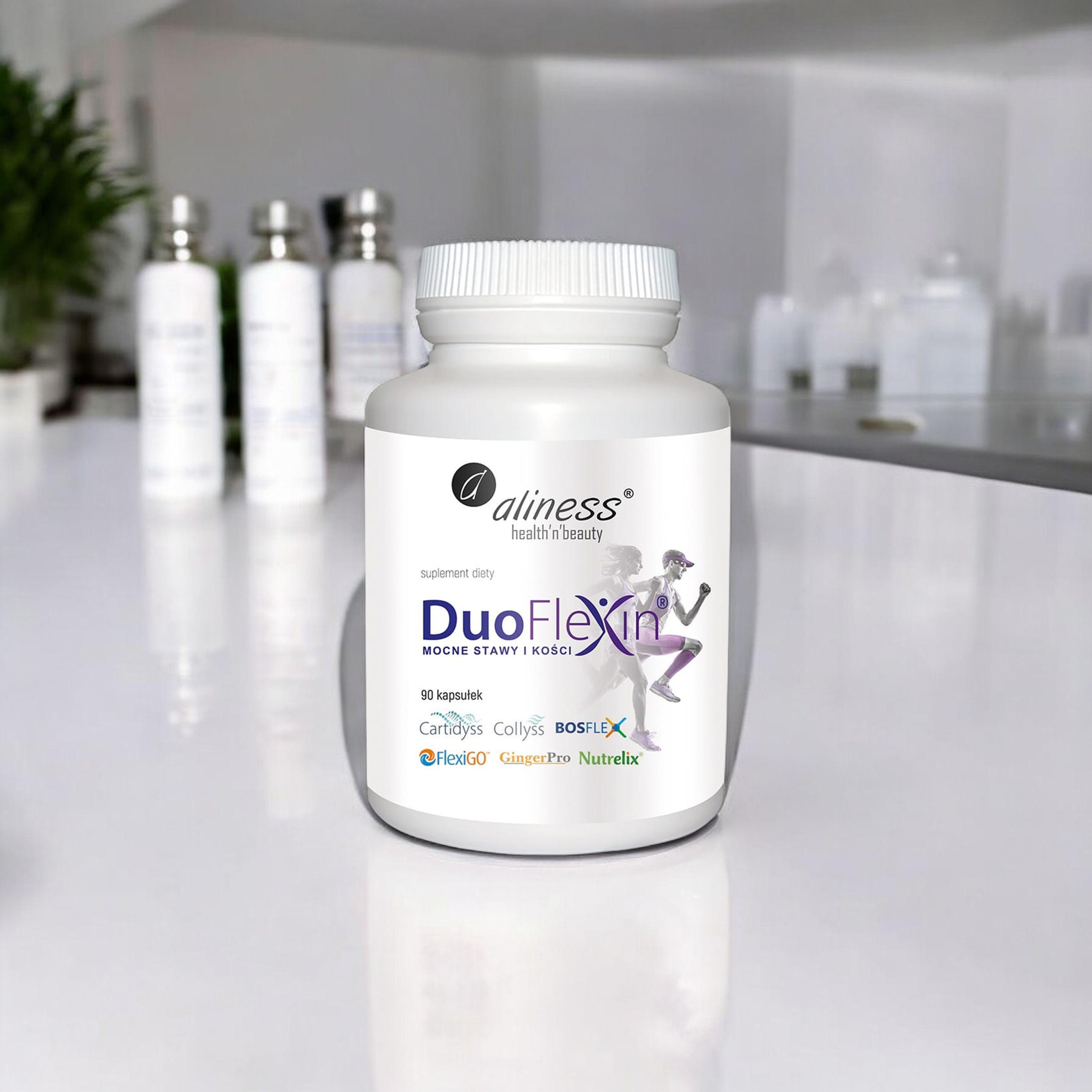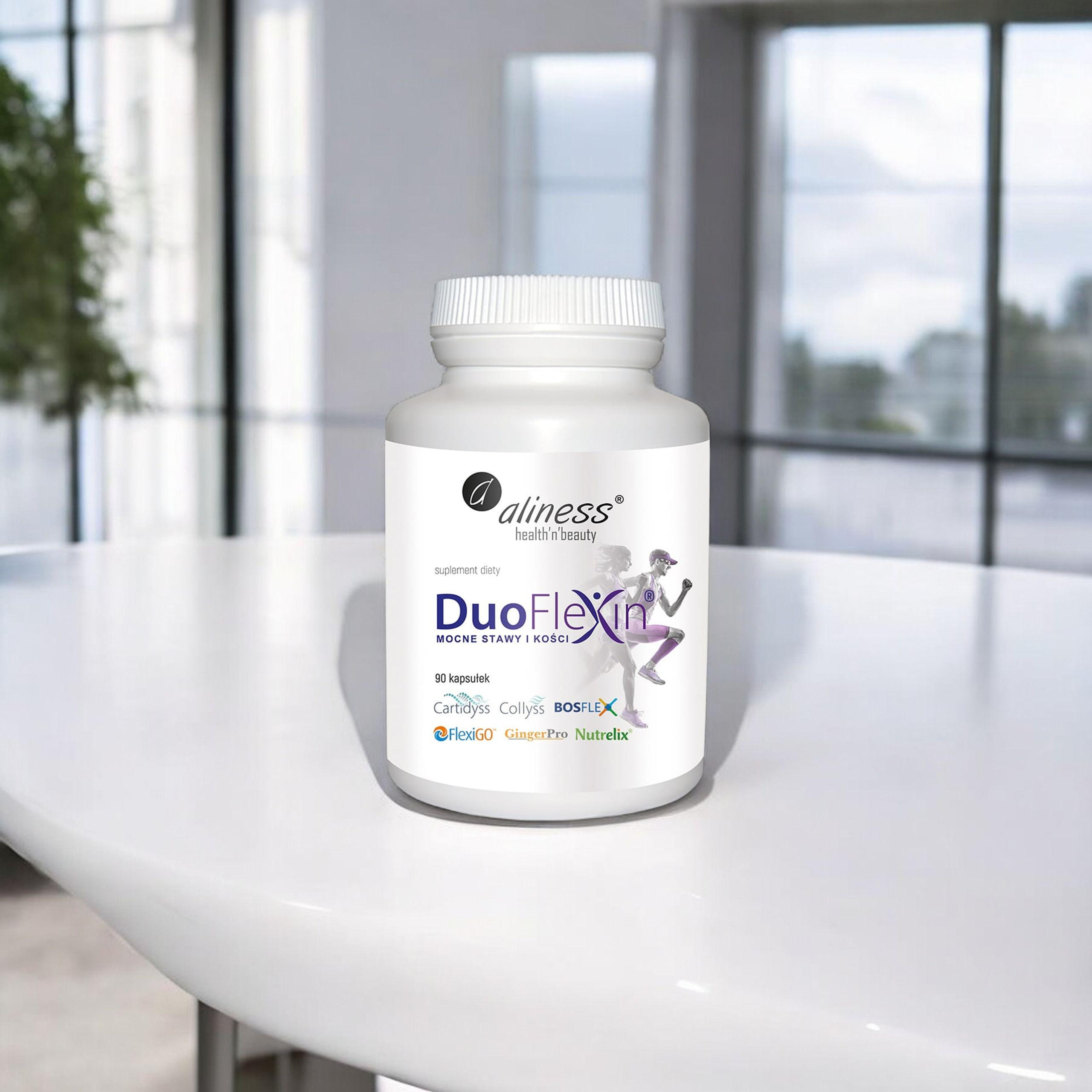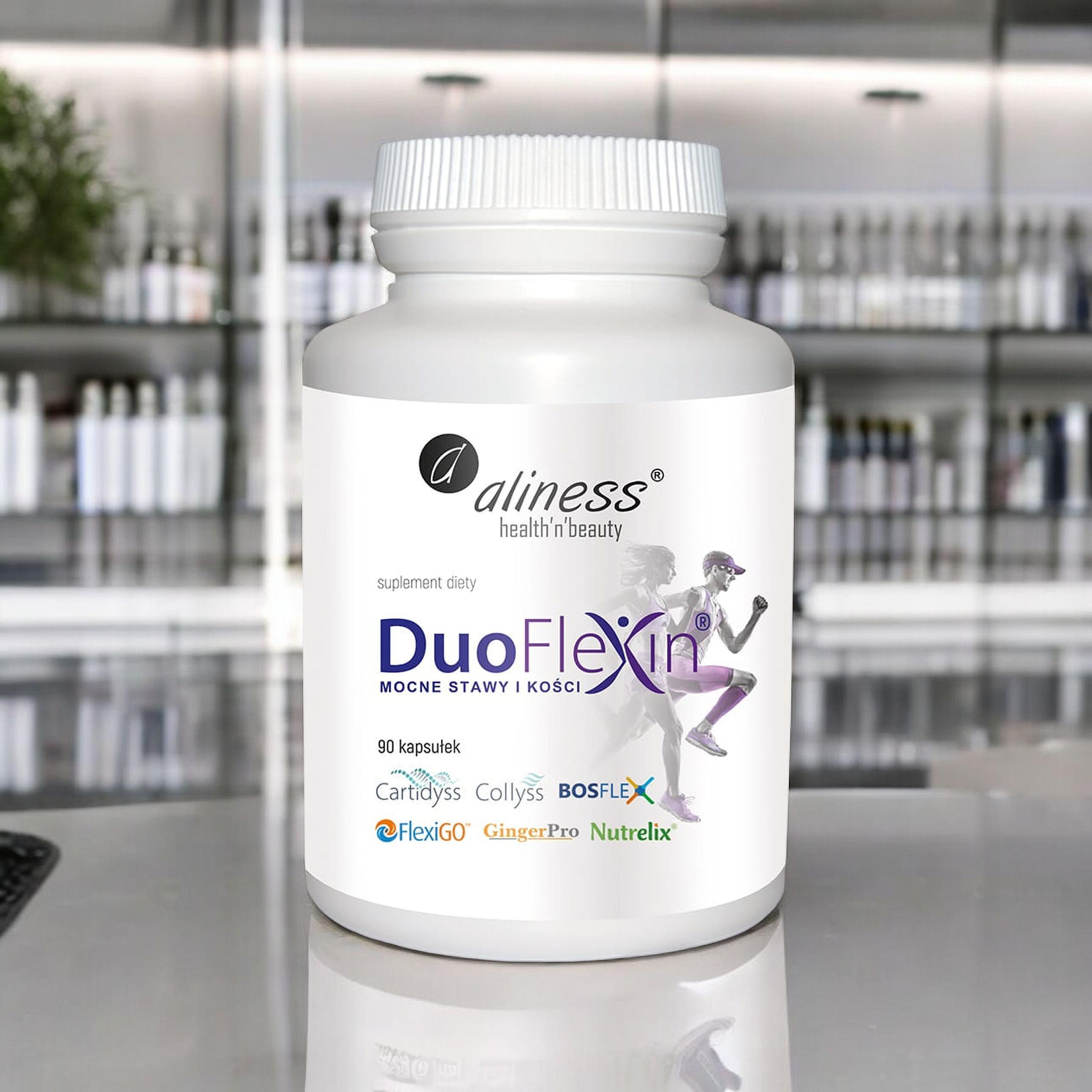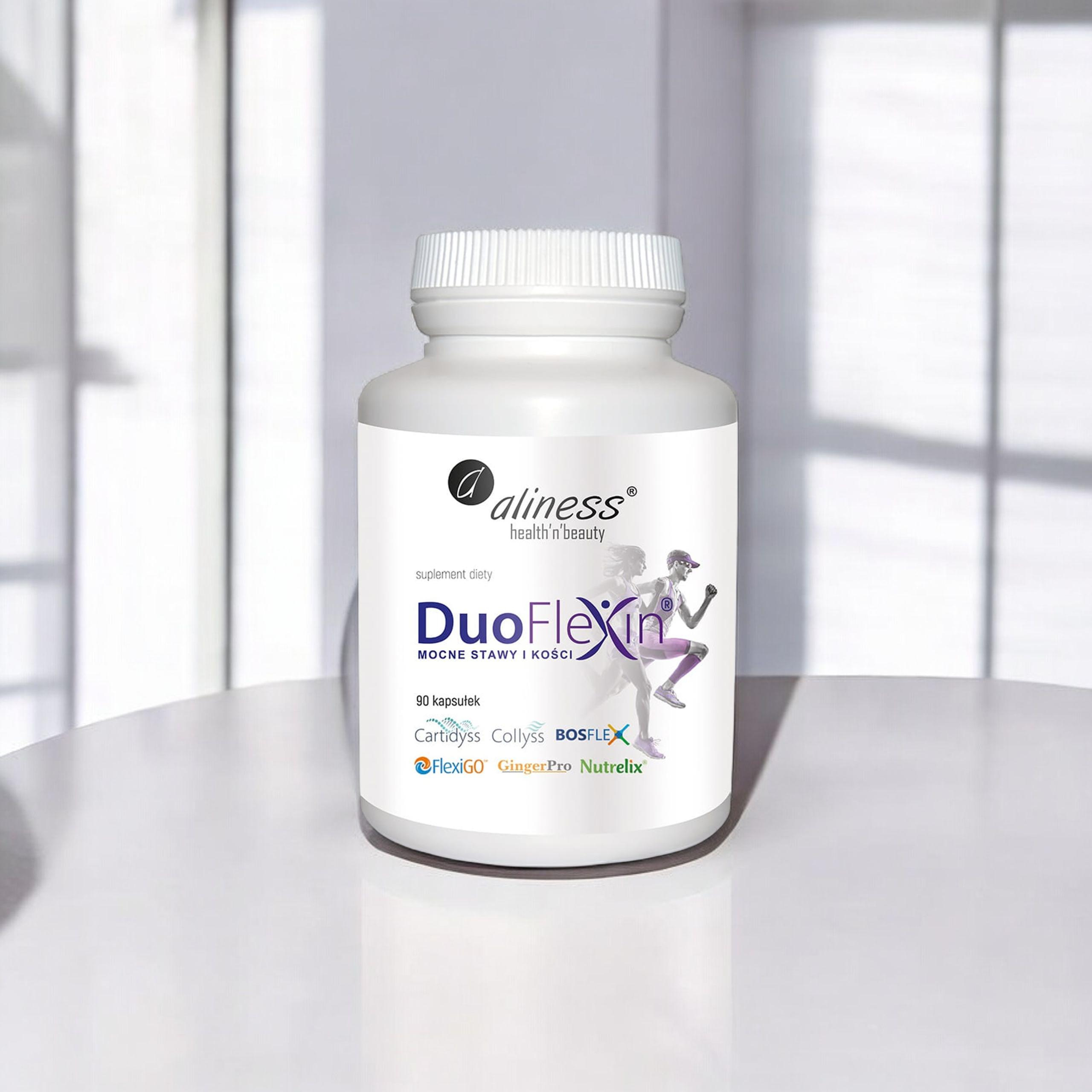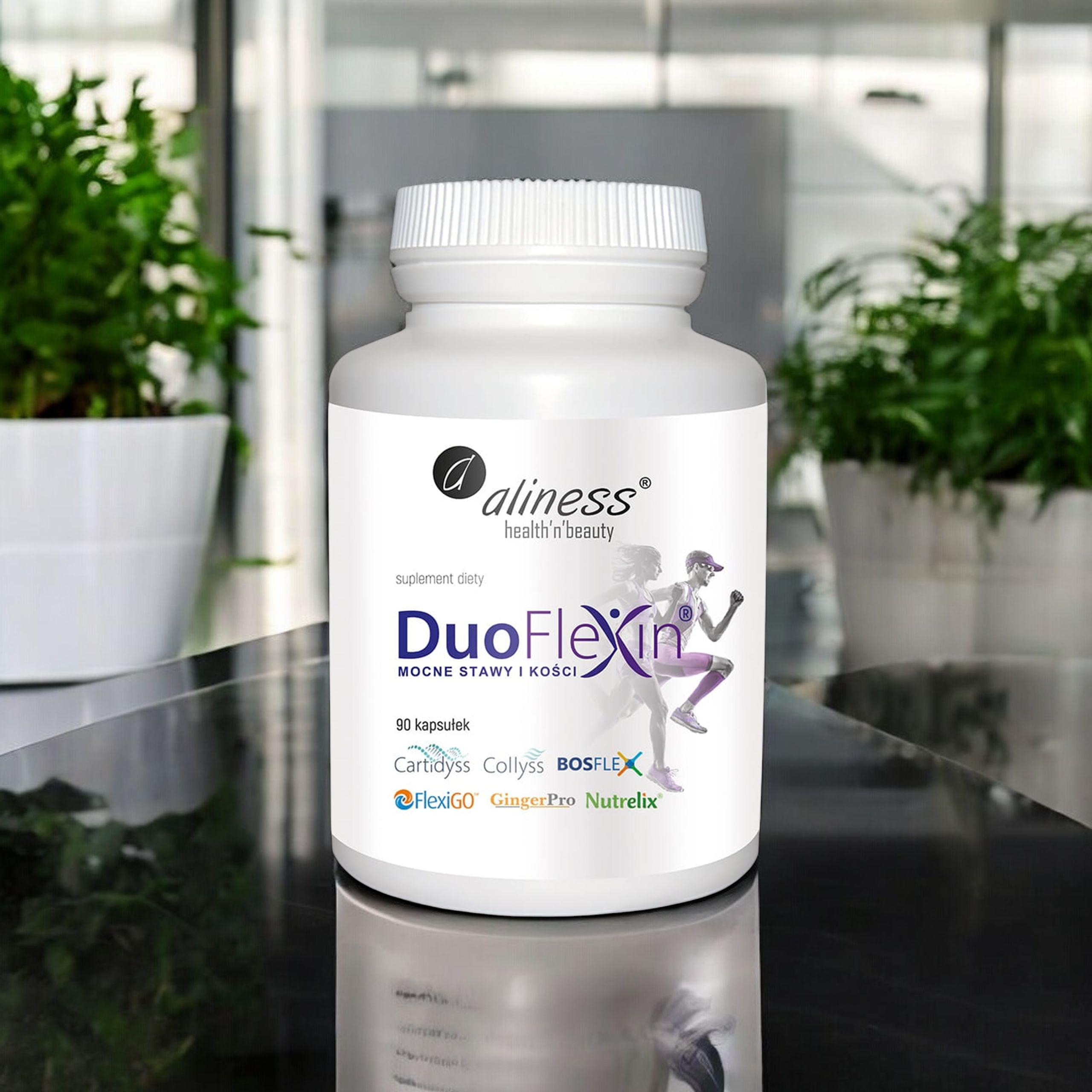 - DuoFlexin od Aliness to suplement diety wzmacniający układ kostno-stawowy dzięki dwóm typom kolagenu, witaminie C z aceroli oraz ekstraktom z Boswellii, czarciego pazura i imbiru. Zadbaj o swoje stawy już teraz!