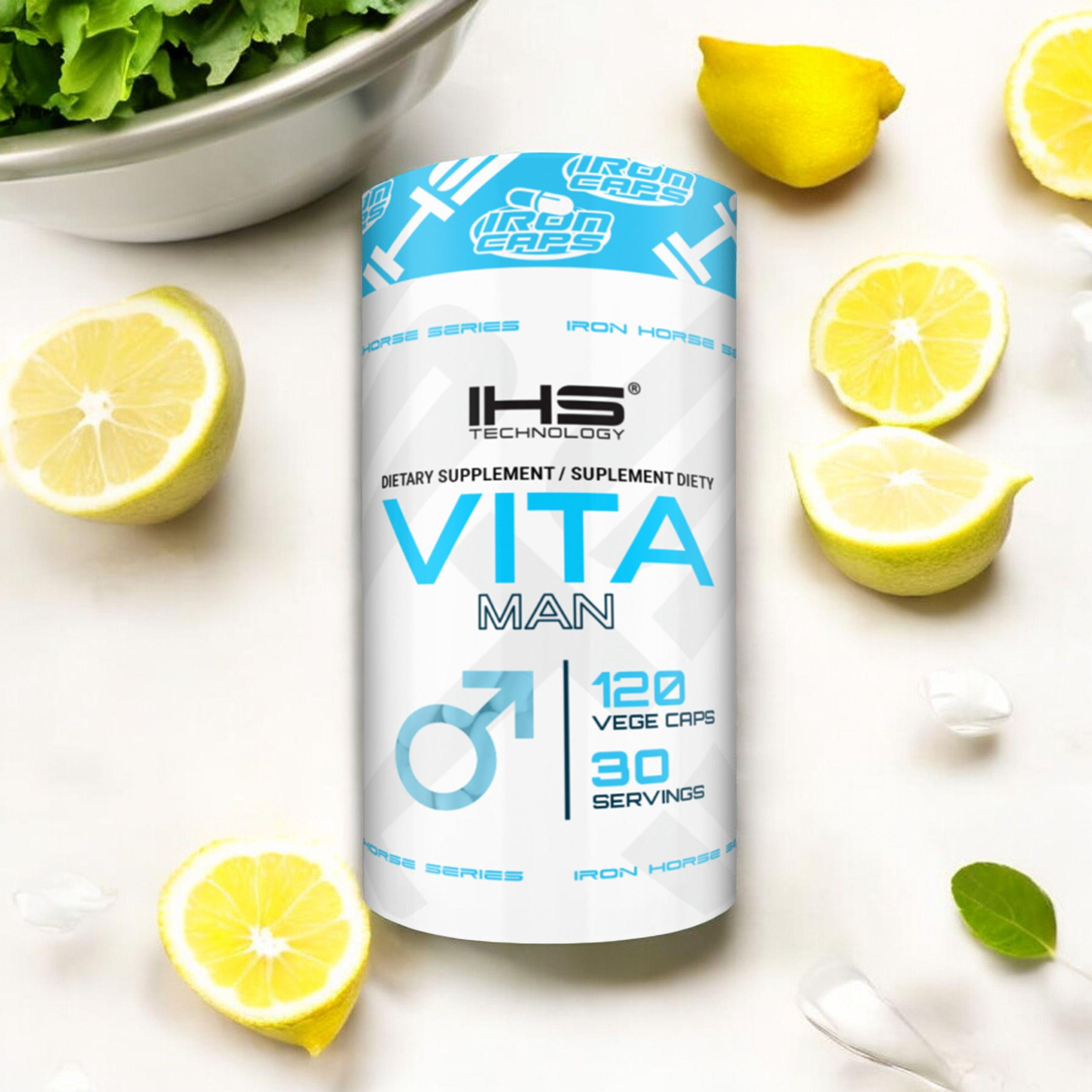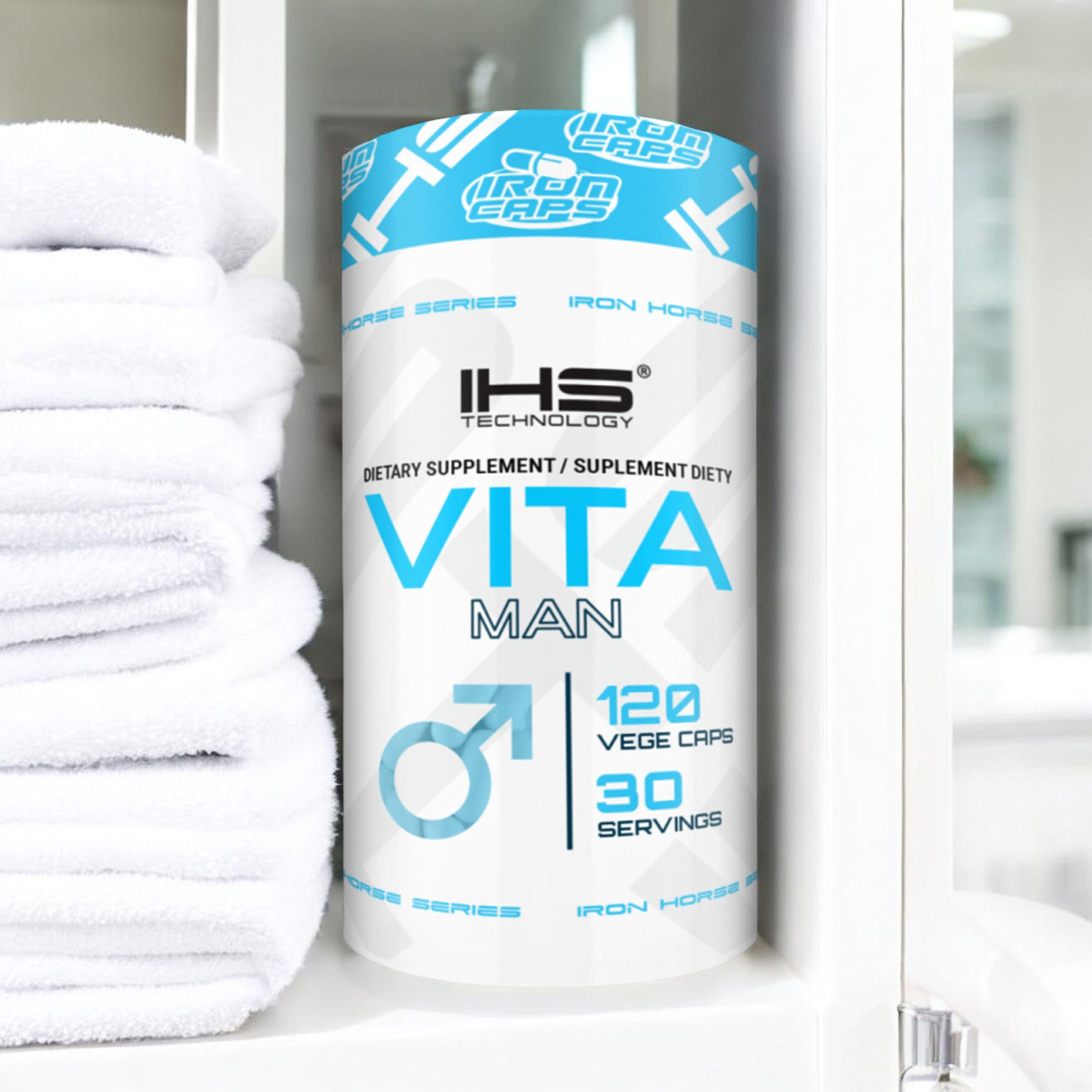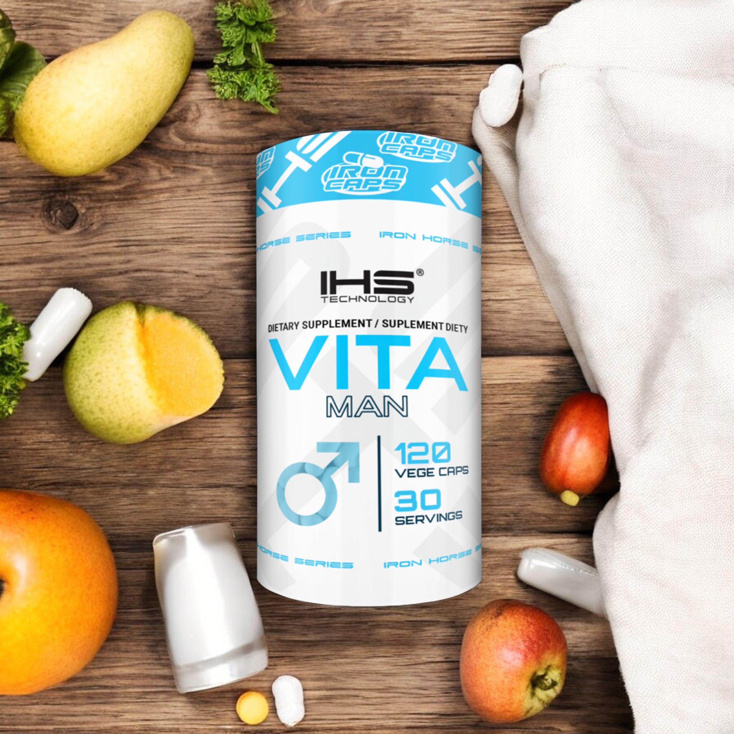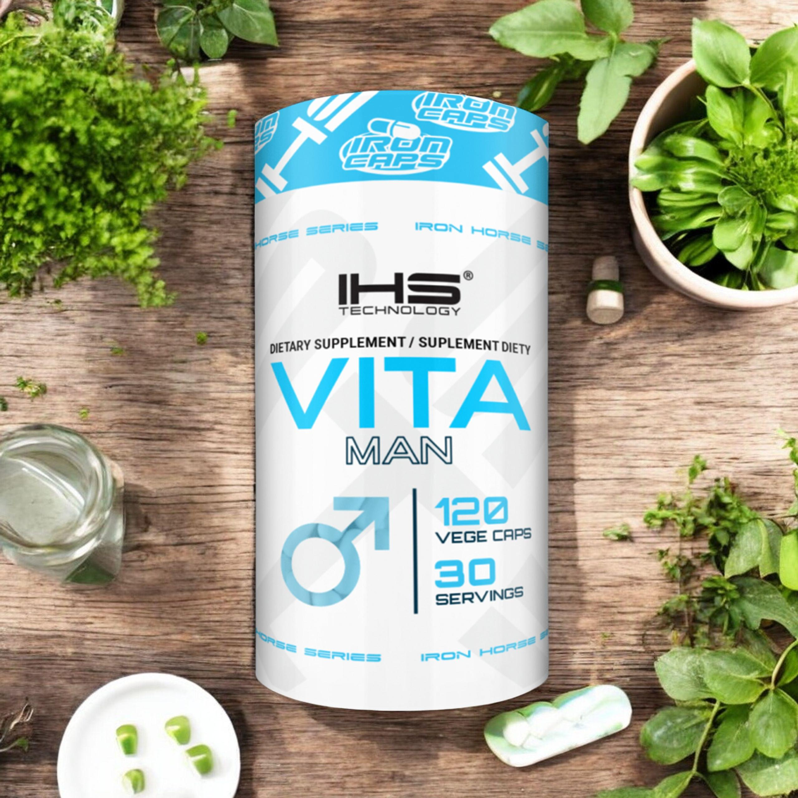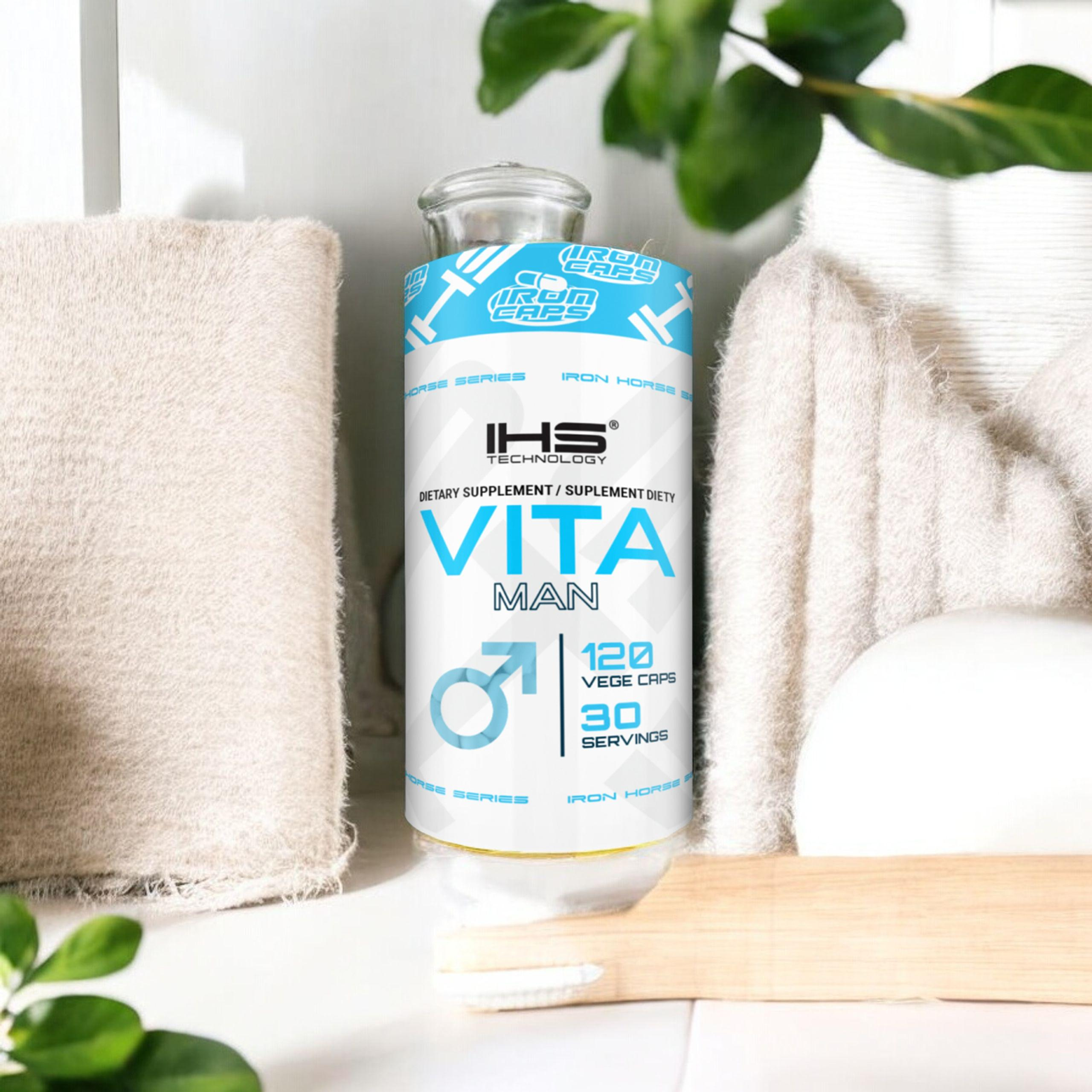 • Vita Man marki Iron Horse Series to kompleksowy suplement dla mężczyzn, zawierający 30 kluczowych składników. Wspiera energię, koncentrację, odporność i ogólną witalność. 120 wegetariańskich kapsułek.
