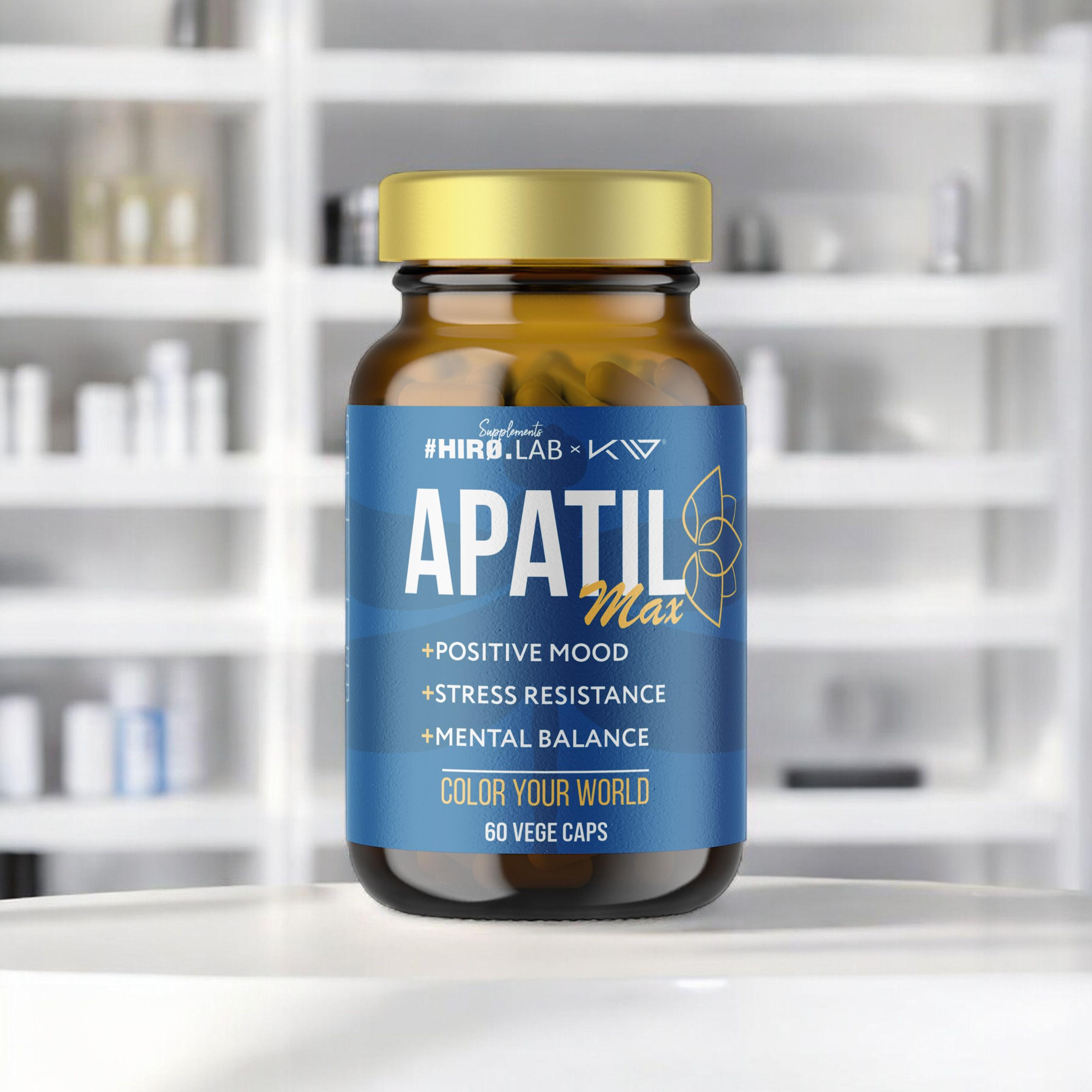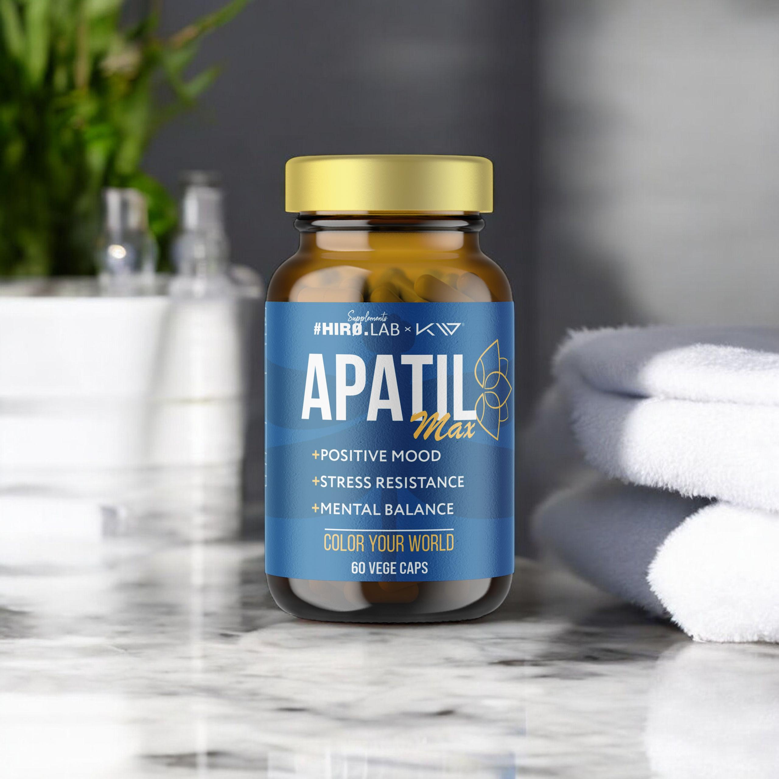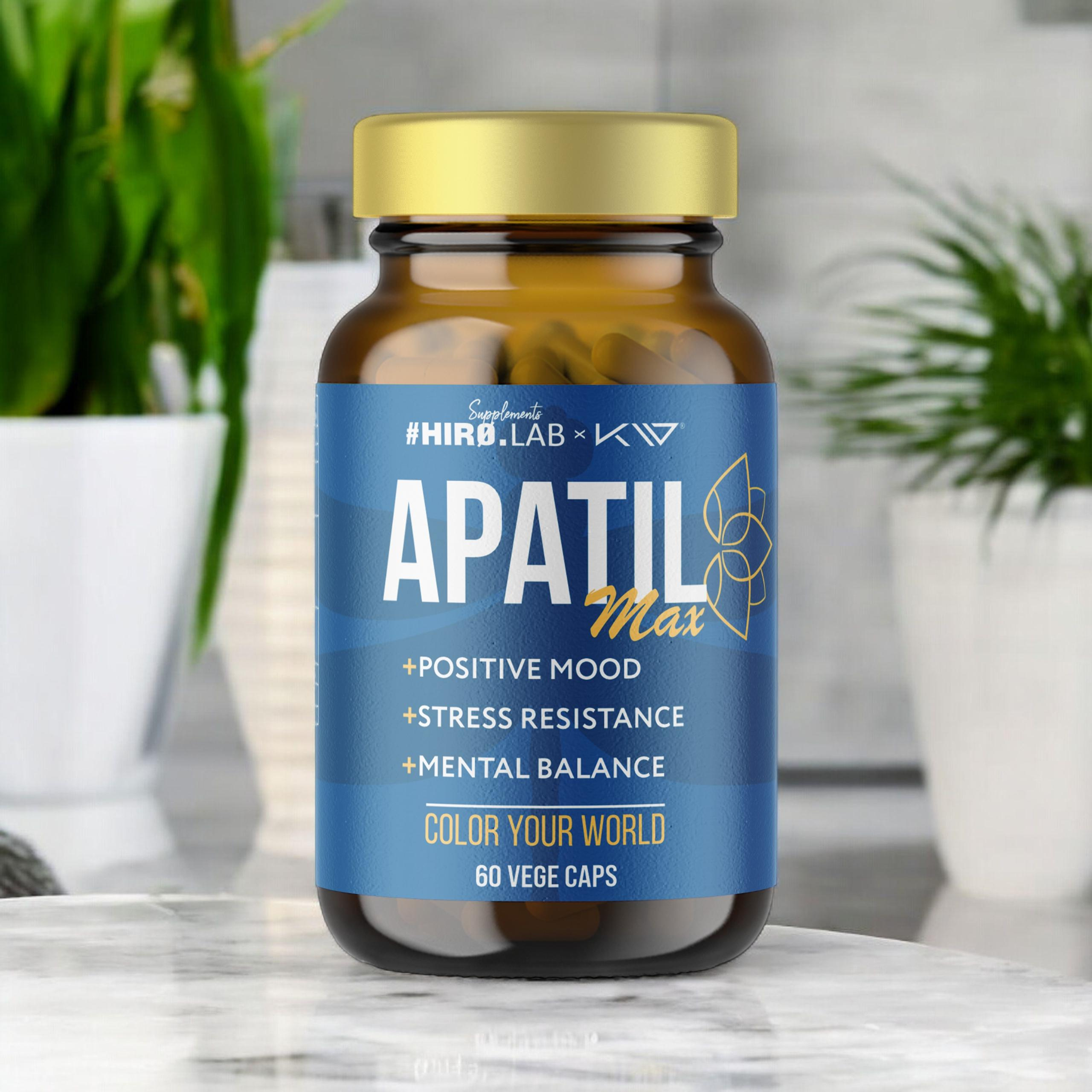 - Apatil Max to suplement diety wspierający nastrój, odporność na stres i równowagę psychiczną. Zawiera inozytol, tryptofan, szafran, Ashwagandhę, żeń-szeń, błonnik jabłkowy, niacynę, cynk i witaminę B6.
