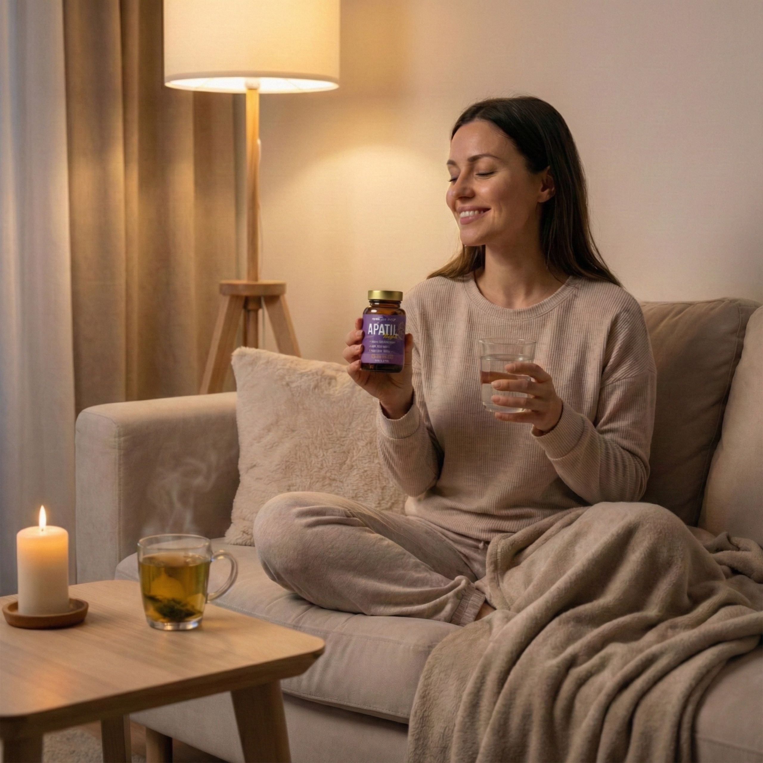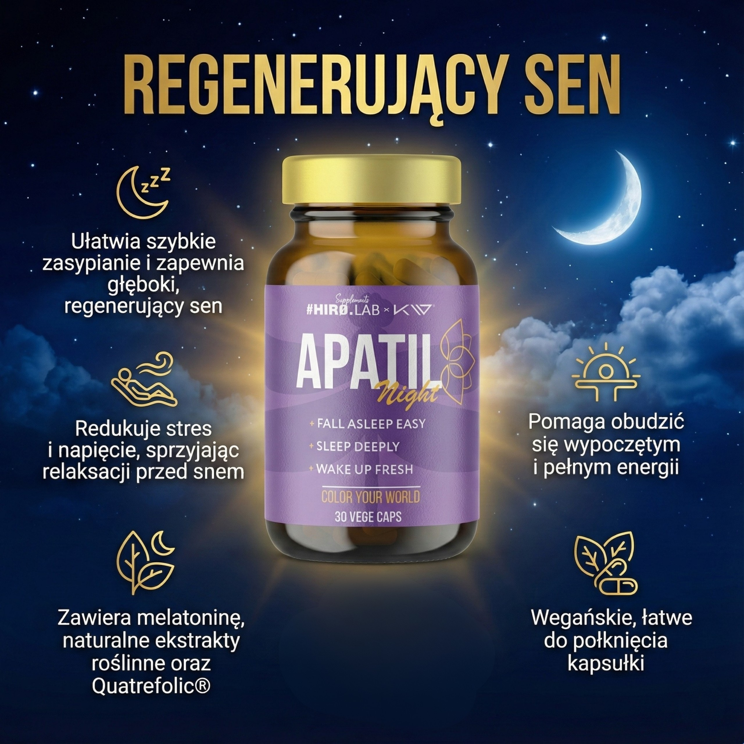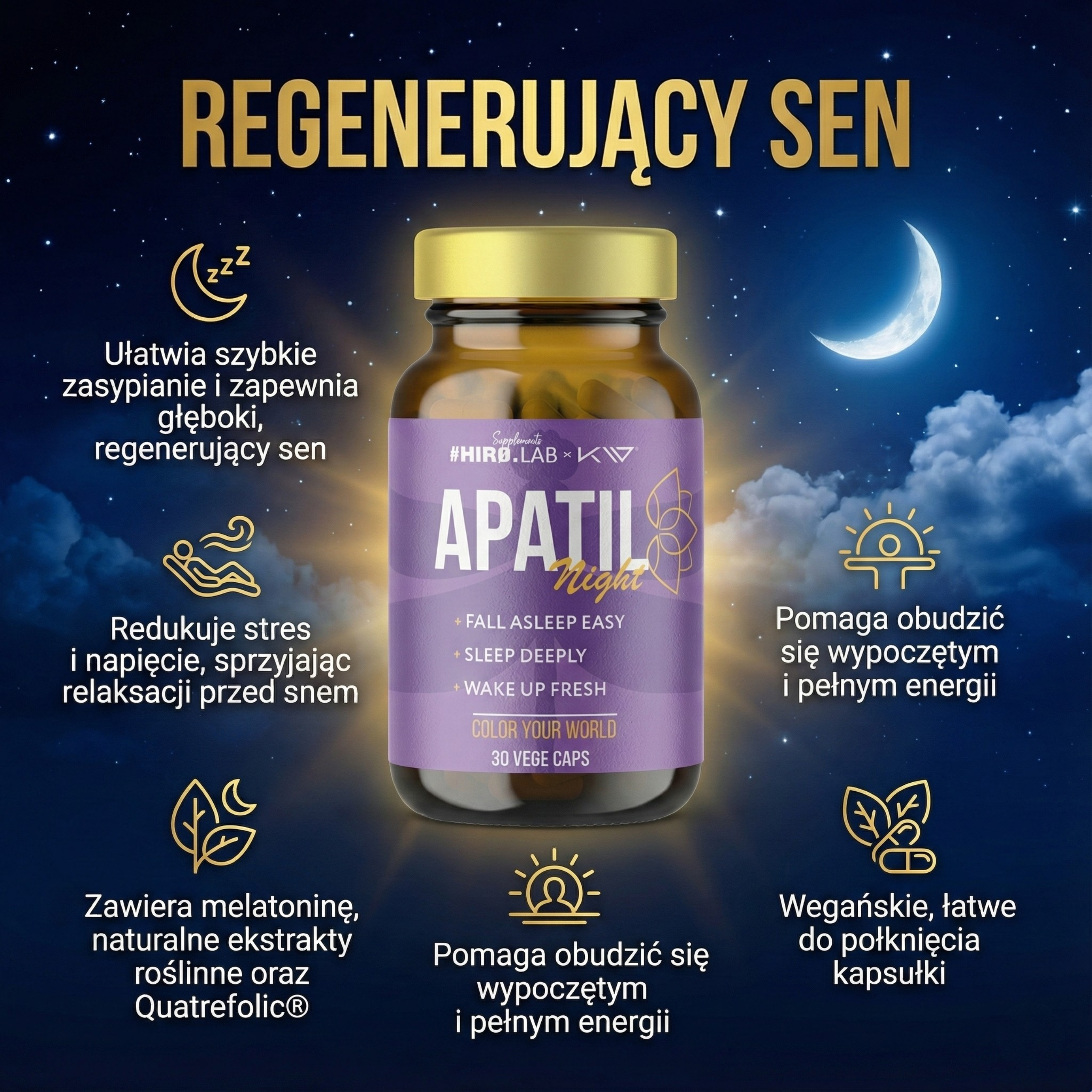 - Apatil Night to suplement wspomagający zasypianie, głęboki sen i poranne odświeżenie. Zawiera L-teaninę, walerianę, mak polny, męczennicę, melatoninę oraz kwas foliowy, wspierając zdrowy i spokojny sen.