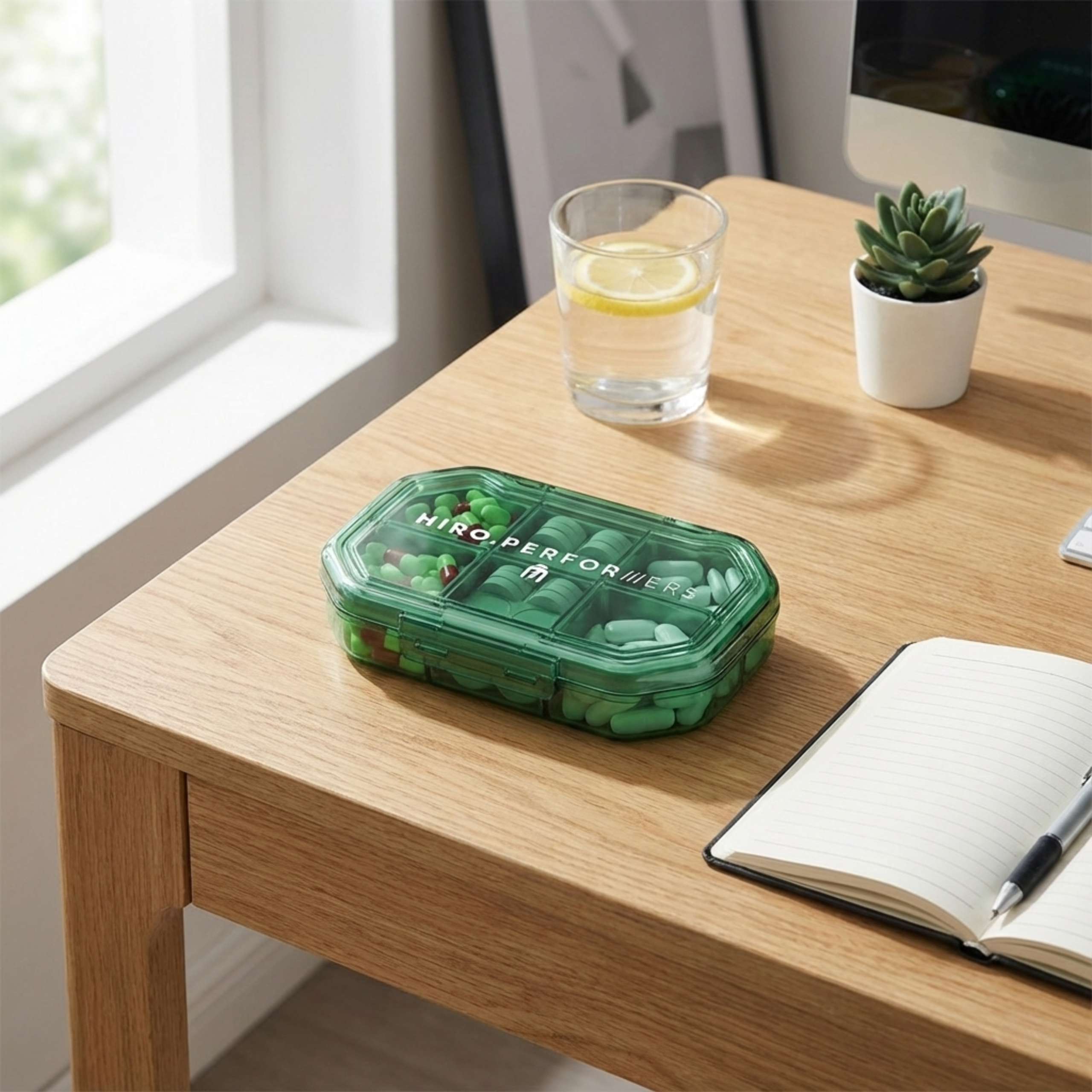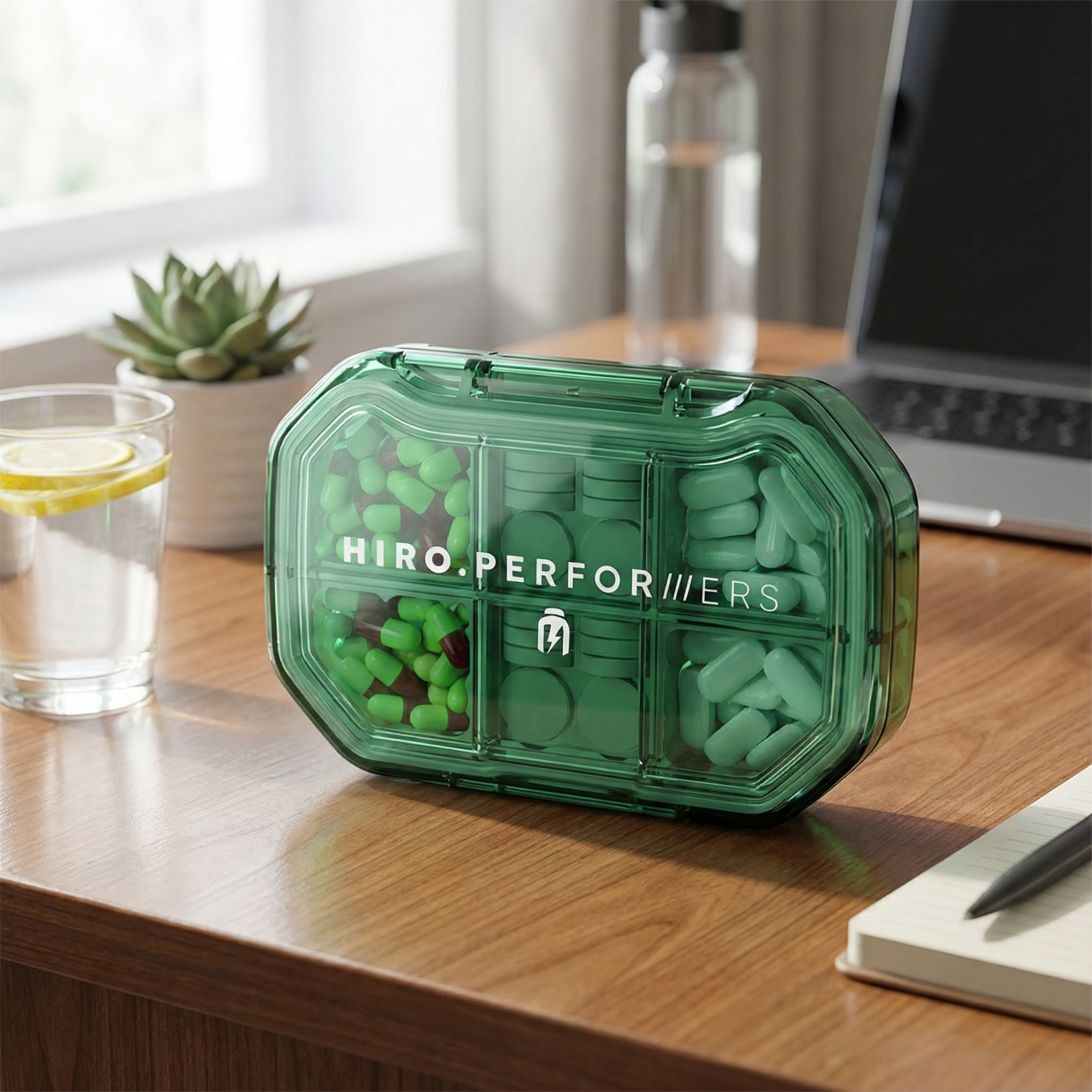 HIRO.LAB PillBox HIRO.PERFORMERS to elegancki organizer na suplementy, stworzony z materiałów premium dla osób aktywnych i sukcesu.