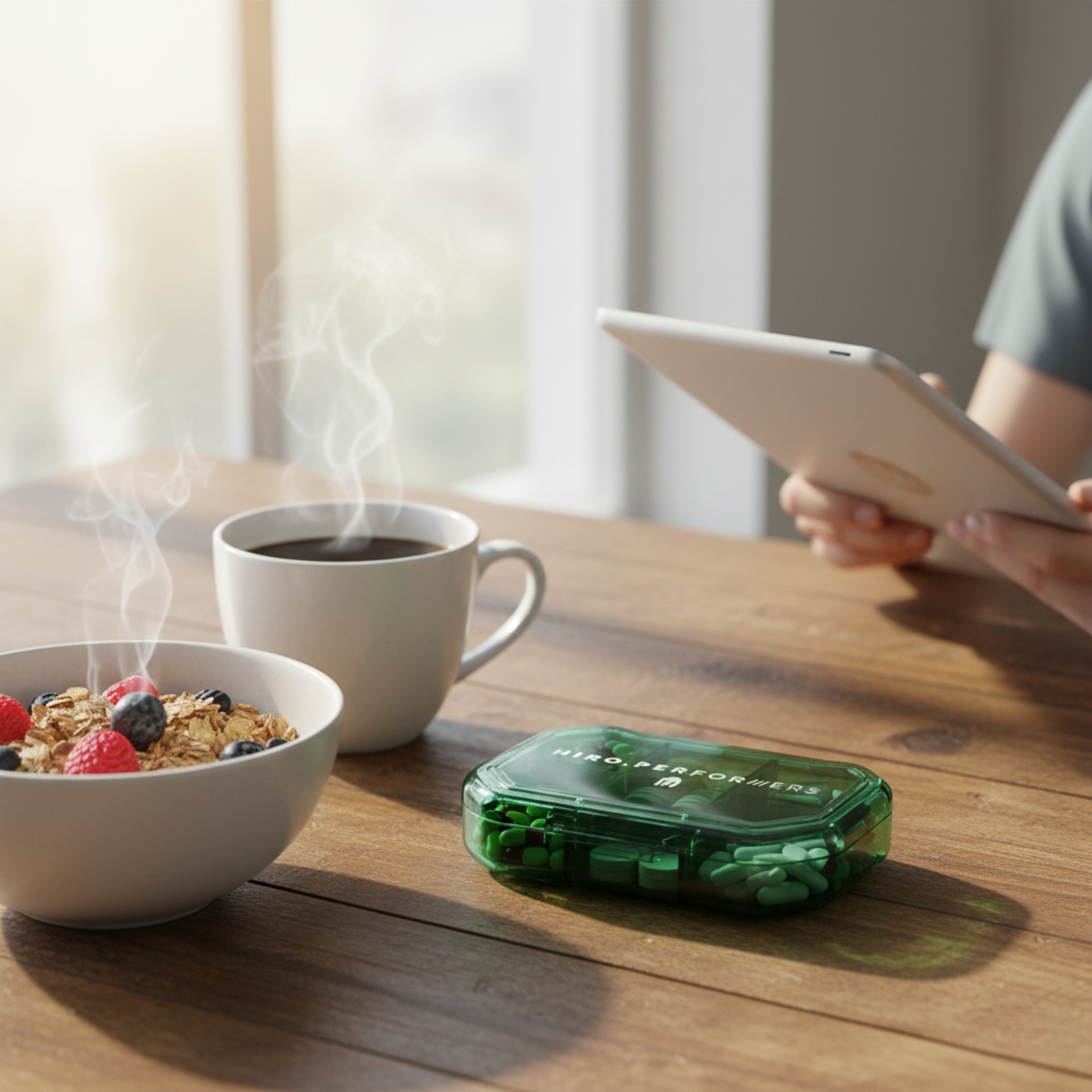 Wyobraź sobie poranek, w którym wszystko jest pod kontrolą. Nie szukasz nerwowo suplementów wspomagających koncentrację przed ważnym spotkaniem. Nie zastanawiasz się, czy zabrałeś ze sobą Lion's Mane na długi dzień w biurze czy Ashwagandhę przed intensywnym treningiem. HIRO.PERFORMERS to coś więcej niż organizer – to system zarządzania Twoją wydajnością. W dzisiejszym świecie, gdzie każda minuta ma znaczenie, osoby osiągające cele nie pozostawiają niczego przypadkowi. Twoja suplementacja to inwestycja w siebie – w swoją koncentrację, energię i regenerację. Ale ta inwestycja przynosi rezultaty tylko wtedy, gdy masz swoje wsparcie zawsze pod ręką, dokładnie wtedy, gdy tego potrzebujesz. Dla przedsiębiorców, sportowców i wszystkich, którzy mierzą wysoko, brak organizacji nie jest opcją. Każdy dzień przynosi nowe wyzwania, a Ty potrzebujesz narzędzi, które dotrzymają Ci tempa. HIRO.PERFORMERS został zaprojektowany właśnie z myślą o Tobie – o osobie, która wie, że szczegóły tworzą całość, a przygotowanie to klucz do zwycięstwa.