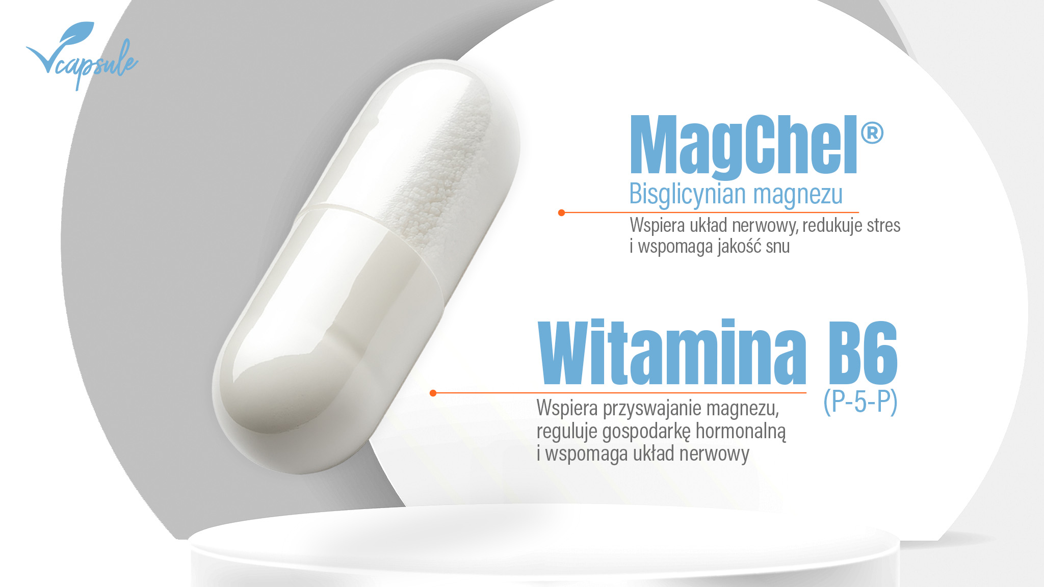 MagChel® to opatentowana forma bisglicynianu magnezu o wyjątkowej przyswajalności i stabilności chemicznej. Dzięki połączeniu magnezu z glicyną łatwo przenika przez ściany jelit, skutecznie zasilając organizm. Wyróżnia się farmaceutyczną czystością i potwierdzoną skutecznością. Dodatek aktywnej witaminy B6 (P-5-P) poprawia wchłanianie magnezu, wspiera gospodarkę hormonalną oraz produkcję neuroprzekaźników, takich jak serotonina i dopamina.