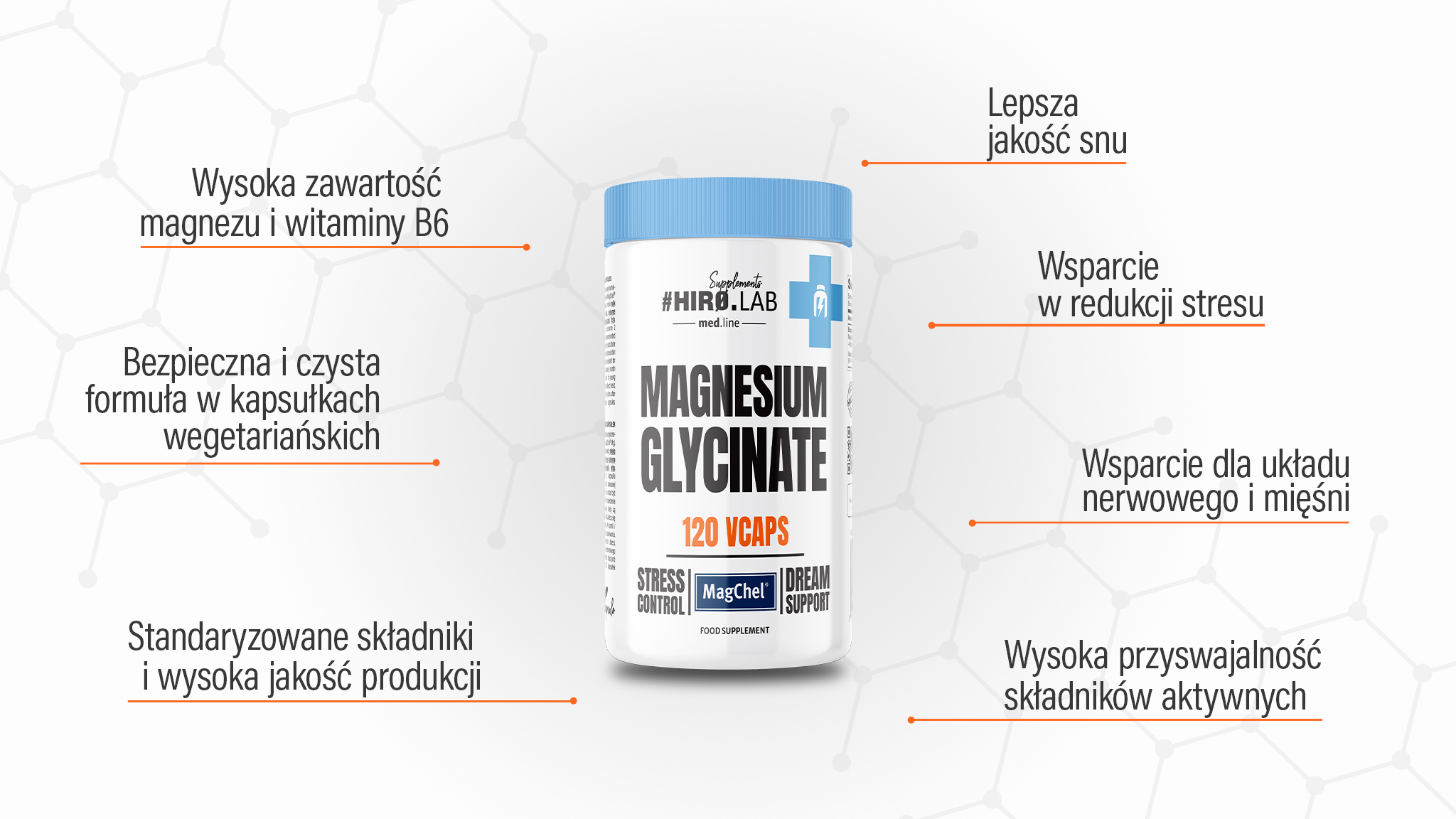 Żyjesz intensywnie, źle sypiasz, brakuje Ci energii? HIRO.LAB Magnesium Glycinate to wsparcie dla układu nerwowego, lepszej regeneracji i głębszego snu. Idealny dla zestresowanych, przemęczonych, aktywnych fizycznie i umysłowo. Redukuje napięcie, poprawia jakość snu i pomaga odzyskać energię. Wystarczą 2 kapsułki wieczorem. 120 kapsułek = 60 dni spokoju w jednym opakowaniu.