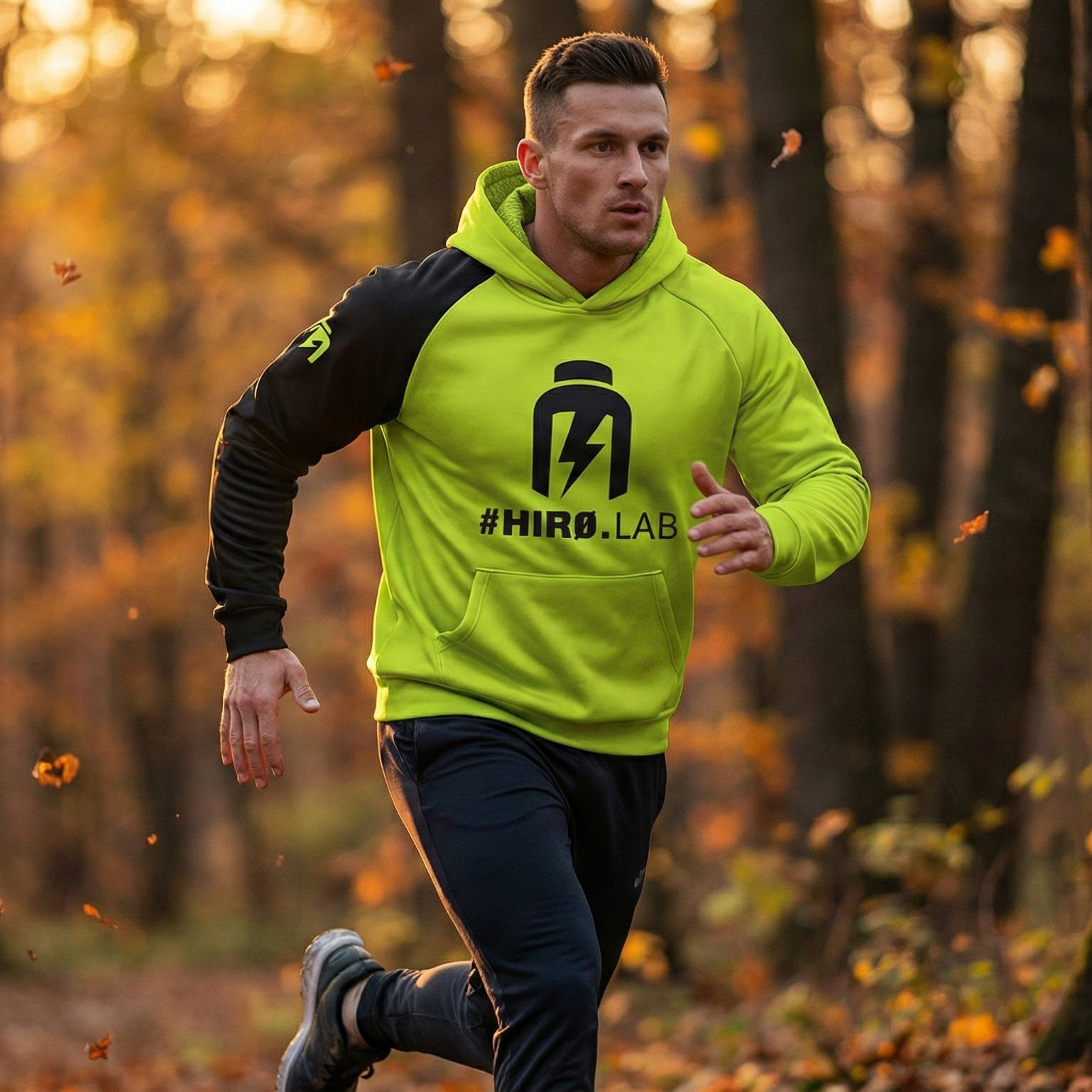 HIRO.LAB HOODIE to bluza dla mężczyzn, którzy wiedzą, czego chcą – i nie potrzebują tego mówić na głos. Dynamiczna kolorystyka i wyrazisty branding nie zostawiają wątpliwości: to ubranie dla tych, którzy działają z mocą, konsekwencją i pasją. Neonowa zieleń z czernią tworzą kontrast, który przyciąga uwagę i podkreśla energię – zarówno na treningu, jak i w codziennym biegu. To nie tylko bluza – to komunikat.