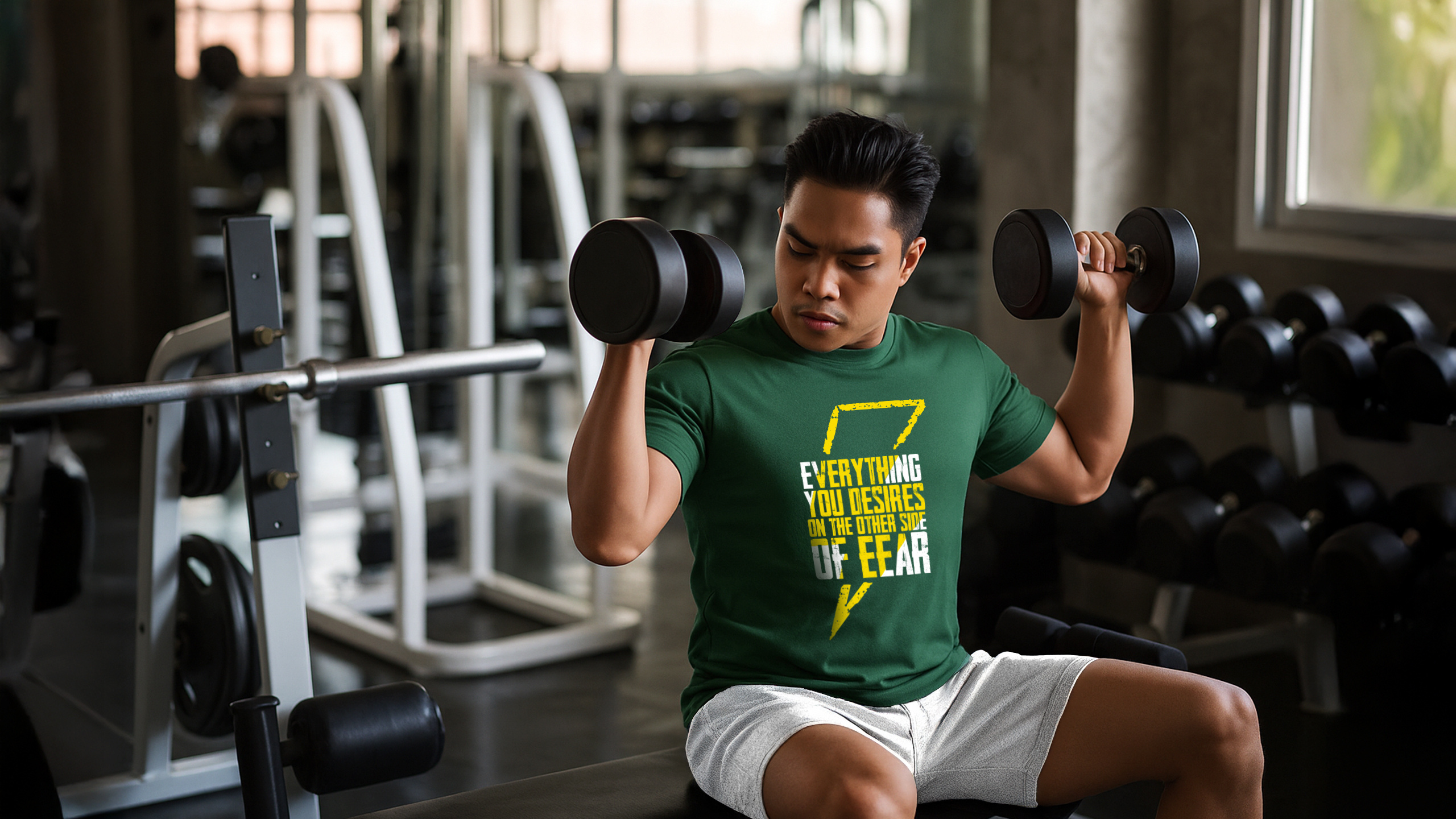 T-shirt “Everything You Desires On The Other Side Of Fear” został stworzony z myślą o tych, którzy nie zatrzymują się w połowie drogi. O ludziach, którzy potrafią zaryzykować, podjąć wyzwanie i przekroczyć własne granice — zarówno na siłowni, jak i w życiu codziennym. To symbol autentyczności, odwagi i wewnętrznej siły, która popycha Cię do działania, nawet gdy inni wątpią.